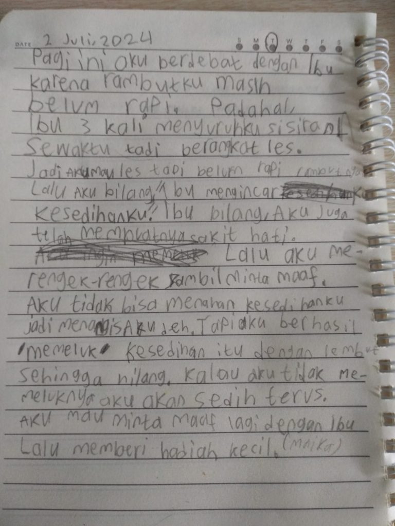Awalnya memang bukan menulis tentang emosinya melainkan peristiwa yang dihadapi atau dianggapnya berkesan atau berat. Biasanya saya akan tanya, dari semua peristiwa yang terjadi hari ini adakah yang paling ingin kamu ceritakan atau tulis? Misalnya seperti jurnal yang ditulis tanggal 2 Juli ini, dia memilih untuk menulis pengalaman emosinya pada kejadian yang melibatkan saya.
